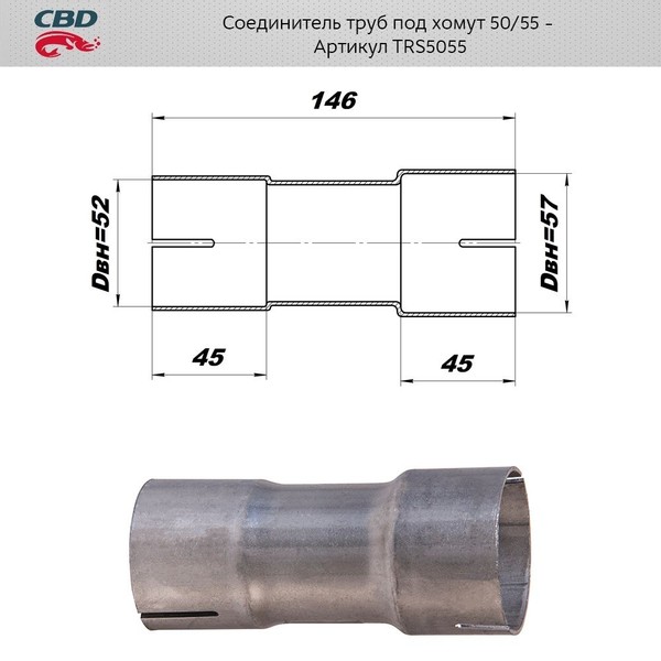 Соединитель труб под хомут. 50/55мм из нерж. алюм. стали [CBD]