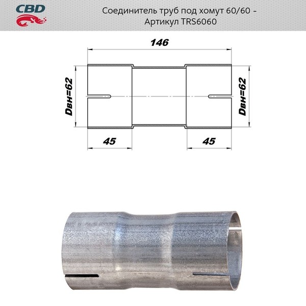Соединитель труб под хомут. 60/60мм из нерж. алюм. стали [CBD]