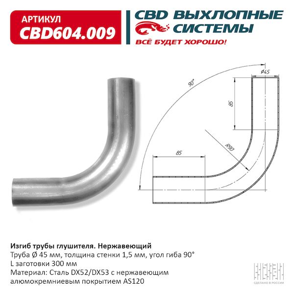 Изгиб трубы глушителя (труба d45, угол 90°, L300) (Нержав./Сталь) [CES OTOMOTIV]